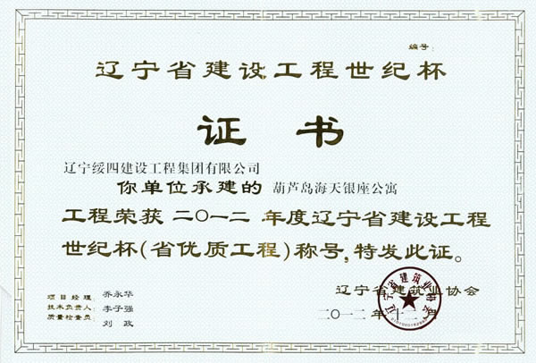 2013年3月12日在沈陽召開2012年度遼寧省建設工程世紀杯(省優(yōu)質(zhì)工程)頒獎大會: